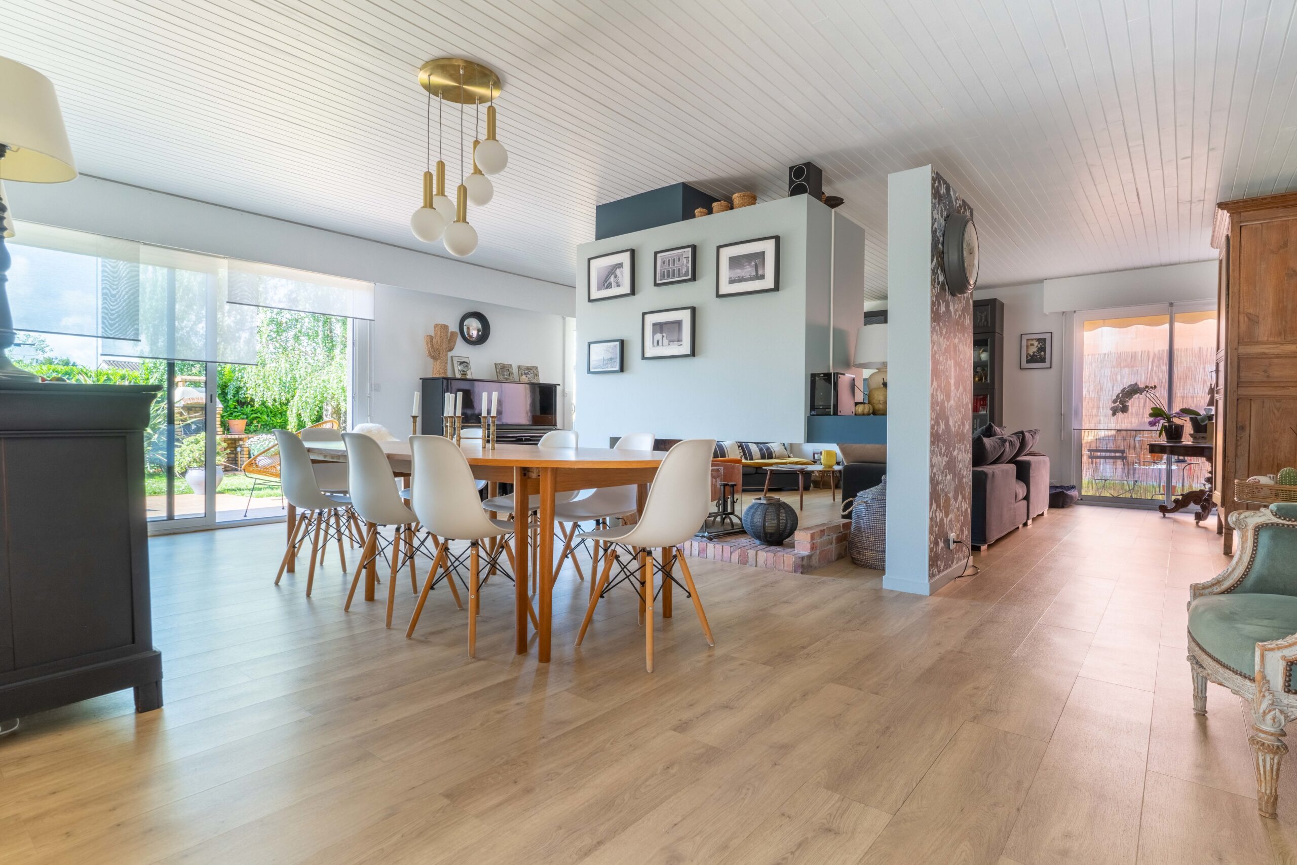 grand salon Un salon avec un grand espace avec une table en bois est des chaises blanches, un mur bleu et décorer avec des cadres.