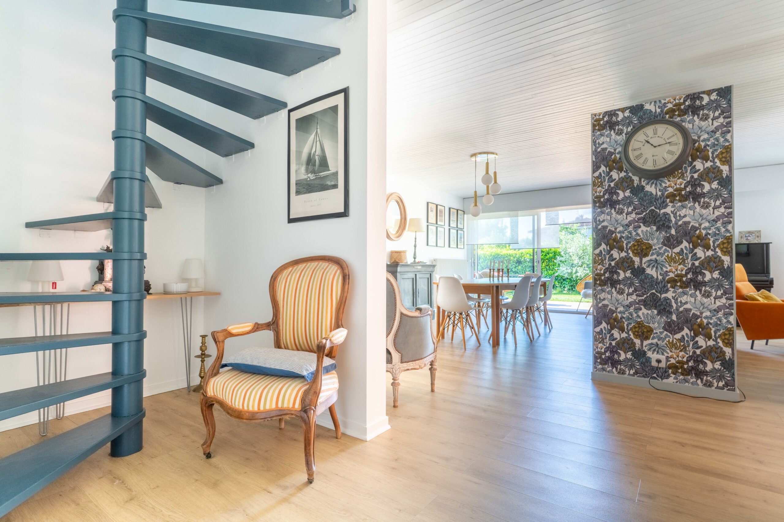 couloir qui donne dans un salon Photo d’un couloir où on a un escalier bicolor avec une chaise en osier et qui donne accès a un salon